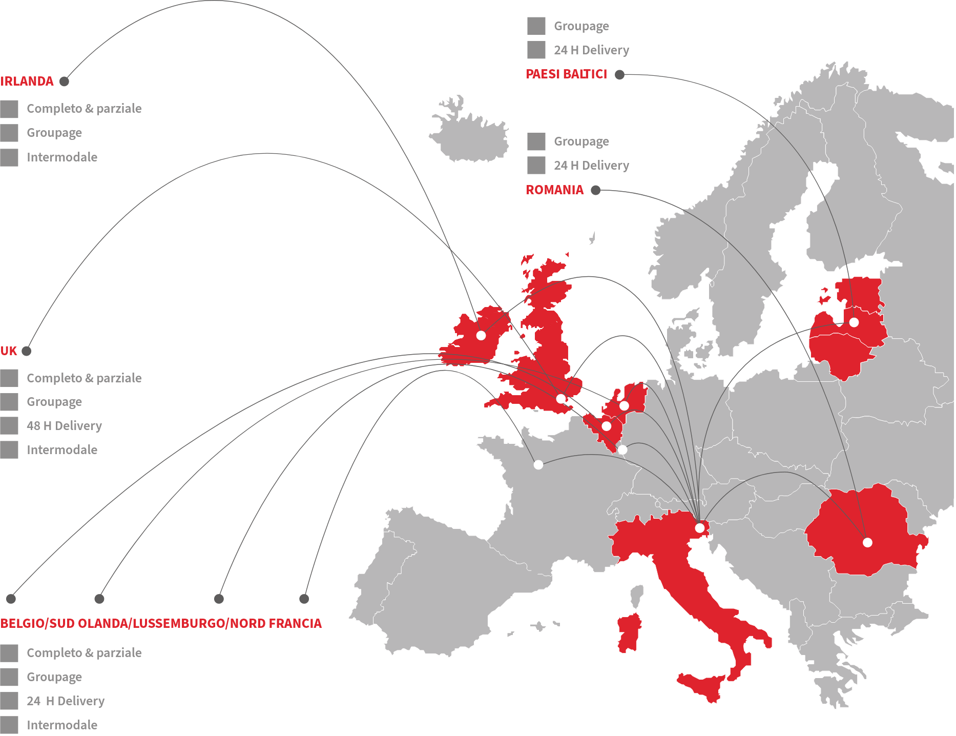 Gran Bretagna, Irlanda, Olanda, Belgio, Romana, Lituania, Estonia, Lettonia (altre destinazioni su richiesta)